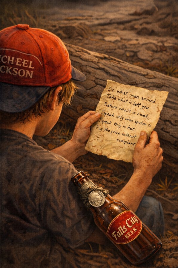 The following morning, Will rose early and slipped out without waking Tom. He headed to the Grove with a mission. He hid the Falls City Beer bottle he was carrying in an oak tree by the path, in a hole high enough off the ground that he had to reach up while standing on his toes. It had to be a bottle to contain the note, and it had to be capped to keep rainwater out. From the ground, it was out of sight. He chose the spot carefully—not buried, not obvious—just out of sight, close to where a boy might wander and a man might one day return. He taped one of the old buffalo nickels to the glass and slipped the note he had written inside because he could not bring himself to speak the words aloud. He told himself that what he was doing was nothing, just a foolish precaution, a way of keeping hope alive, however obscurely, but he knew better. But hope is sometimes stronger than conviction. This was the only way he could think of to keep the wrong he had done from disappearing completely. Some debts, he had begun to understand, do not fade. They wait. Maybe a time will come ...