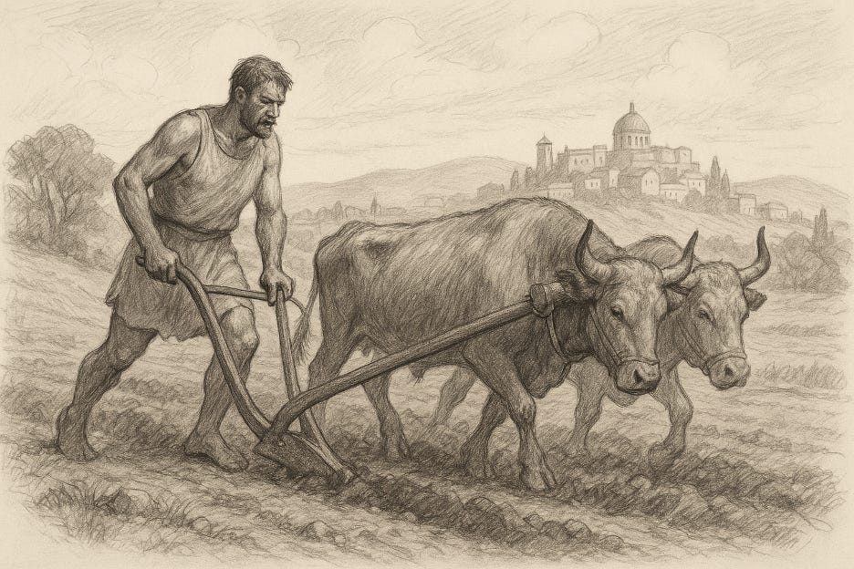 Just now, reader, you are on the western bank of the Tiber River, across from the still youthful city of Rome. It is 458 years before Christ’s birth. You scan the landscape around you. On the horizon, you see on the rising hills to the east the white buildings of the growing city. In the near distance, you watch a farmer at his work. His plain, sleeveless, linen tunic is sweat-stained as he strides along behind his lumbering, plow-pulling team of oxen. It is clumsy work, and he staggers often as he tries to keep the clumsy plow in the resisting earth. The man looks common enough. He is muscled and strongly built and looks all the world like an ordinary farmer.